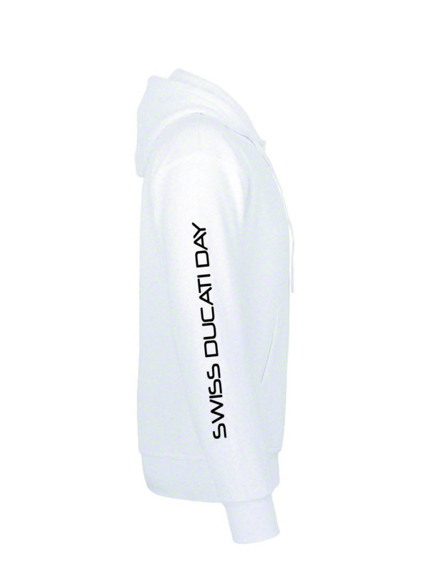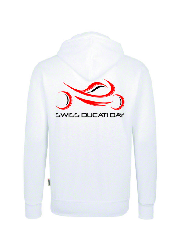 Weiss, mit Swiss Ducati Day Logo auf der Rückseite und Schriftzug am Arm.