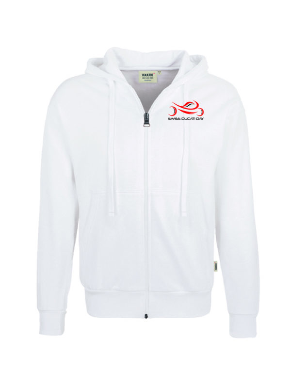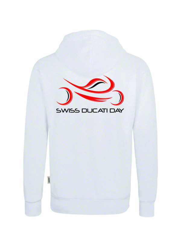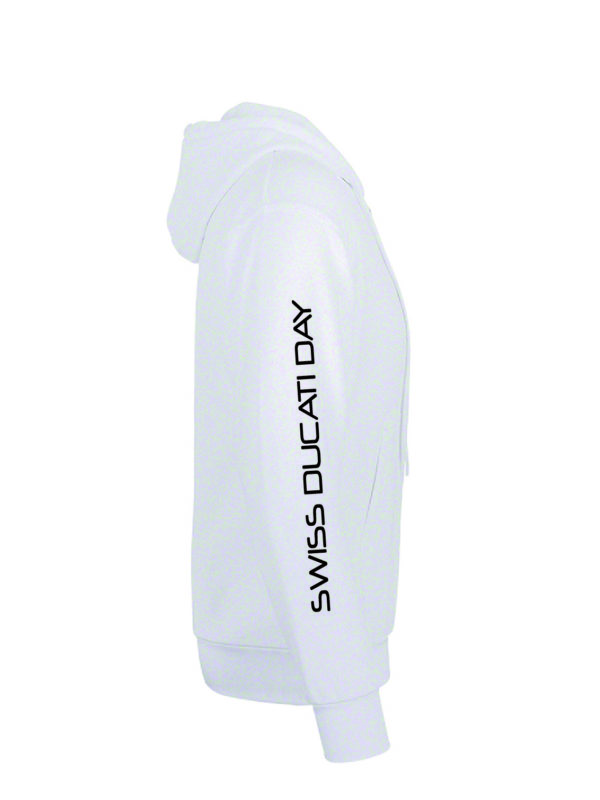 Weiss, mit Swiss Ducati Day Logo auf der Rückseite und Schriftzug am Arm.