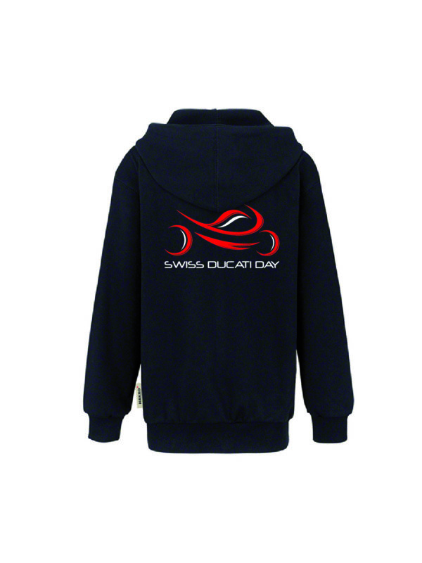 Schwarz, mit Swiss Ducati Day Logo auf der Rückseite (ab Grösse 140).