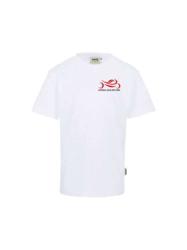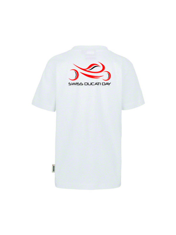 Kurzarm, weiss, mit Swiss Ducati Day Logo auf der Rückseite (ab Grösse 140).