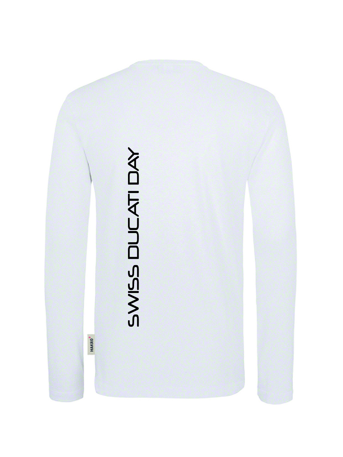 Langarm, weiss, mit Swiss Ducati Day Schriftzug auf der Rückseite.