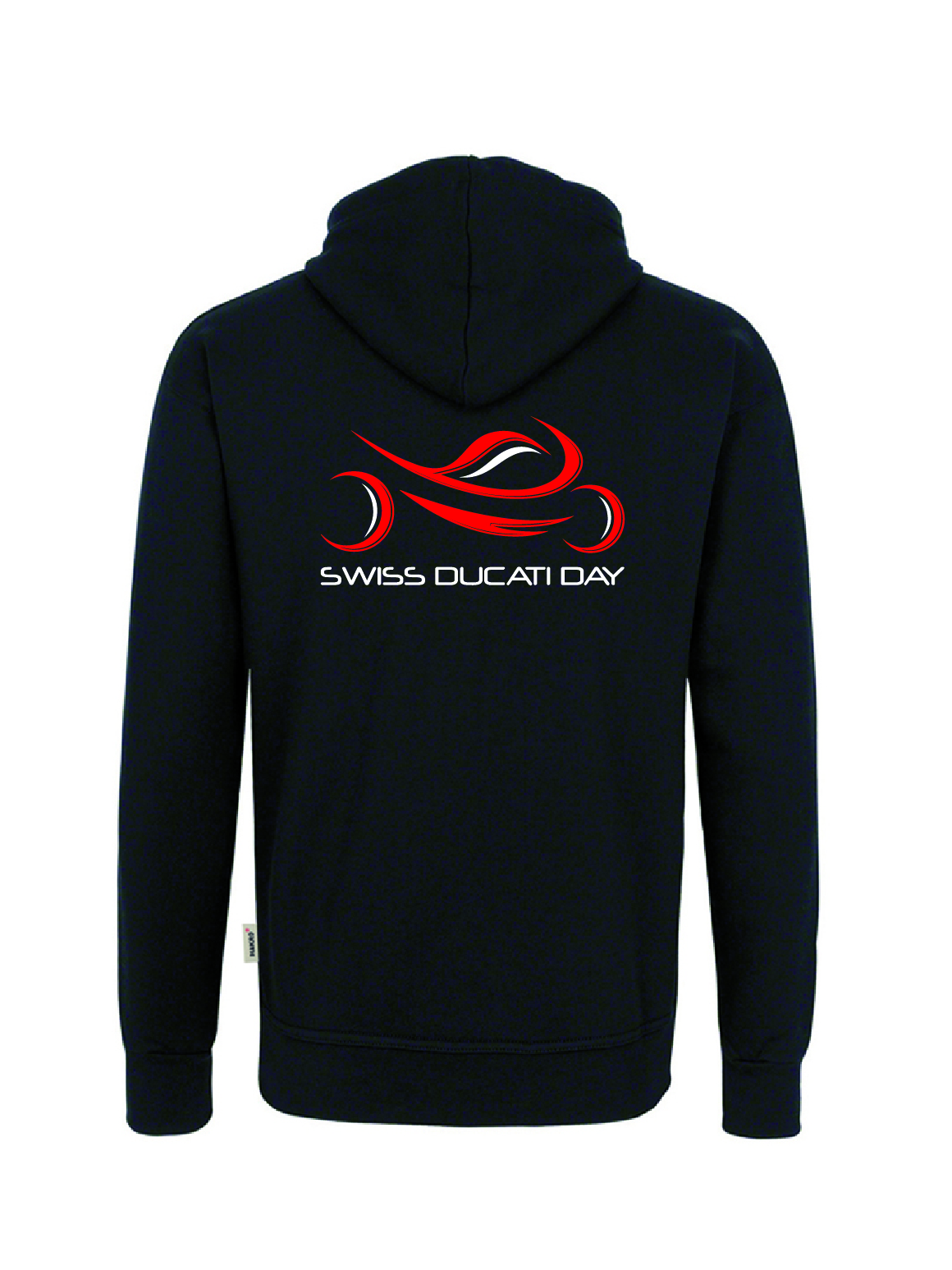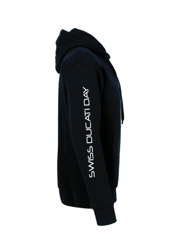 Schwarz, mit Swiss Ducati Day Logo auf der Rückseite und Schriftzug am Arm.
